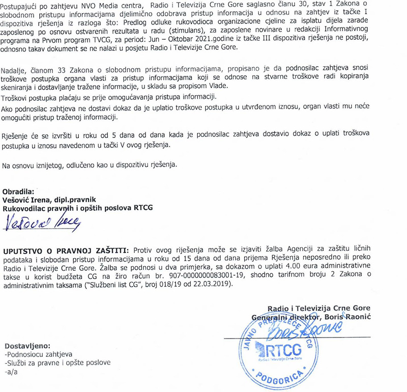 U NASTAVKU ZVANIČNI ODGOVOR PRAVNE SLUŽBE RTCG (U PRVOM PASUSU SAOPŠTAVAJU DA NEMAJU ODLUKE RUKOVODILACA ORGANIZACIONIH JEDNICA) SA POTPISOM GENERALNOG DIREKTORA